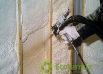 При утеплении каркасных бань пенополиуретаном никаких особых требований к конструкции и к каркасу здания не выдвигается. Пенополиуретан можно наносить абсолютно на любые типы поверхностей даже самой сложной геометрии. Пенополиуретан наносят при помощи специальных распылителей в жидком виде, после высыхания материал отвердевает, образуя на поверхности специальный слой. Внешний слой пенополиуретана имеет свойства мембраны-паробарьера, то есть не пропускает влагу в одном направлении (внутрь), при этом выводя излишки влаги на поверхность.