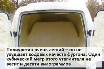 • Полиуретан очень легкий – он не ухудшает ходовых качеств фургона. Один кубический метр этого утеплителя не весит и десяти килограммов