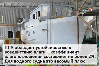 По сути, основную часть материала составляет воздух – более 90 %, поэтому полиуретан очень легкий. Его масса составляет менее 10-ти килограммов на 1 кубометр материала. И это очень важно при утеплении кораблей и яхт, так как не нарушается их плавучесть. Но самое главное – это эффективность. У воздуха самая низкая теплопроводность, за счет этого и удается добиваться такого высокого результата.